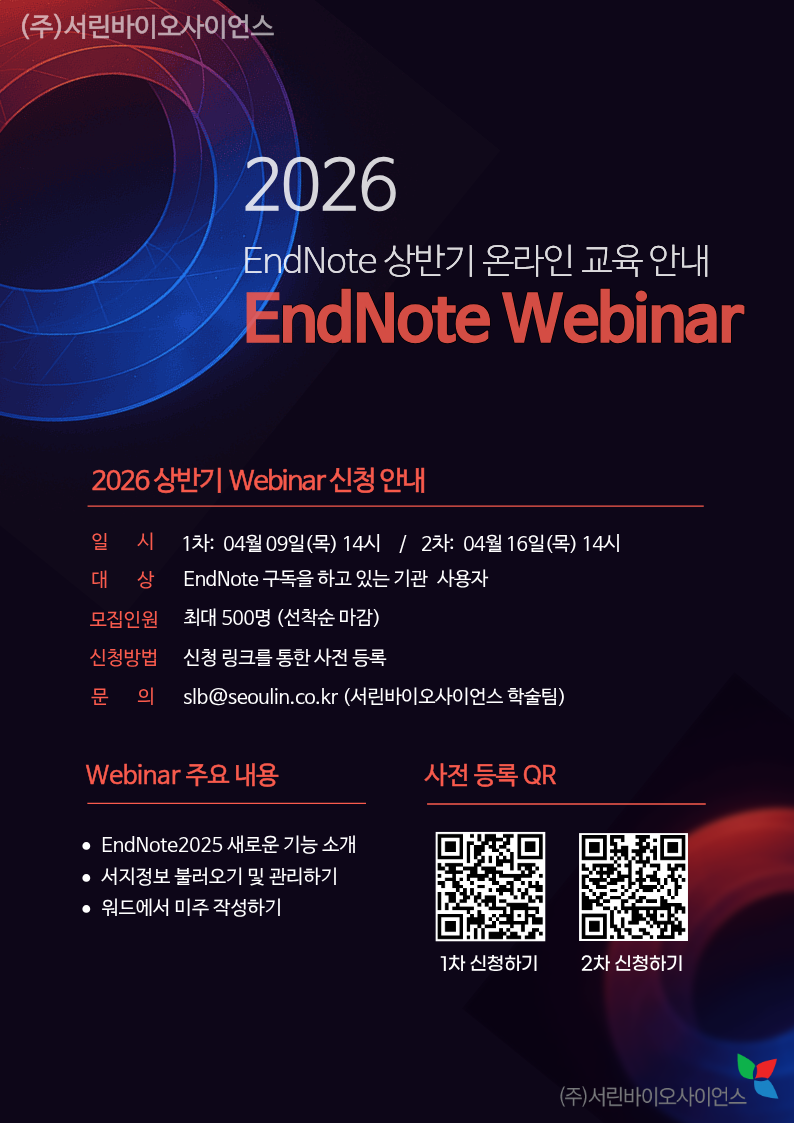 EndNote 국내 공급사인 서린바이오사이언스에서 2026년 상반기 EndNote 사용자 온라인 교육을 아래와 같이 진행합니다.